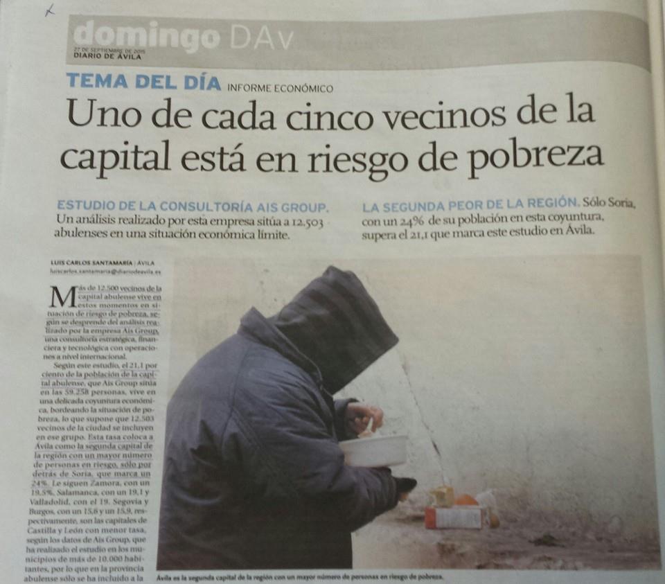 No es una opinión, es una realidad-aseguran desde IU de Ávila. Uno de cada cinco vecinos de la capital de Ávila vive en riesgo de pobreza. Así lo publicaba este fin de semana Diario de Ávila a tenor del estudio realizado por la consultora Ais Group.